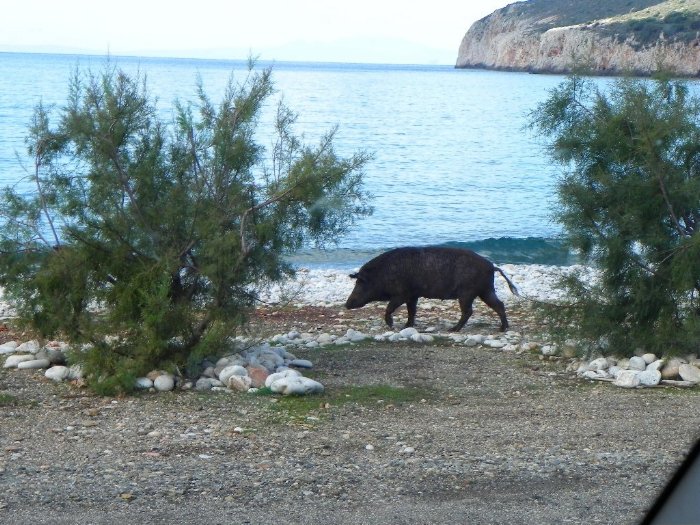 Wildschweinfamilie besucht uns am SP am Strand von Pirgos Dirou - die Bache