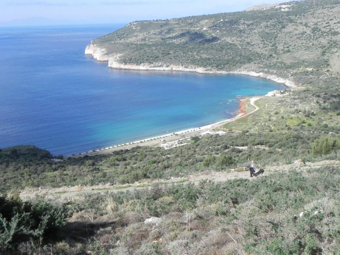 Blick von weit oben auf die Bucht von Pirgos Dirou mit unserem WoMo