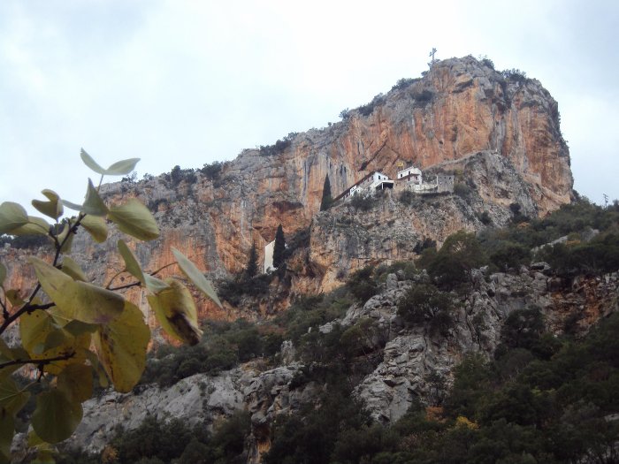 Fahrt über die Berge von Skala nach Leonidio/nun geht es hinab in die Dafnon-Schlucht/Kloster über uns am Felsen