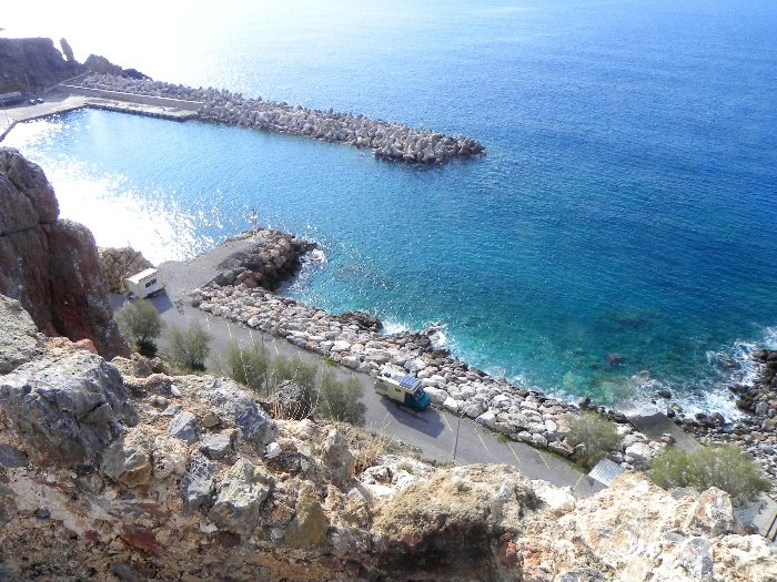 Blick von einem Berg bei Sfakion auf unser Auto und den Hafen