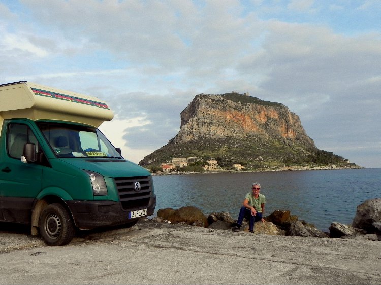 Stellplatz auf dem Parkplatz mit sicht auf das alte Monemvasia