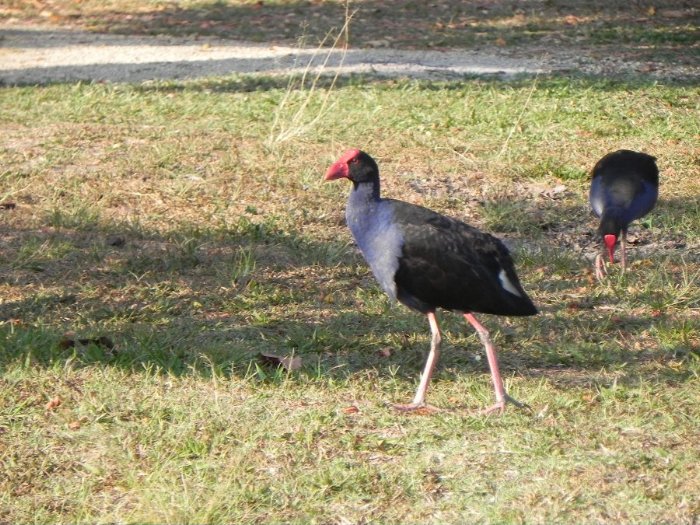 die Purpurhühner suchen oft ihr Futter auf dem Platz