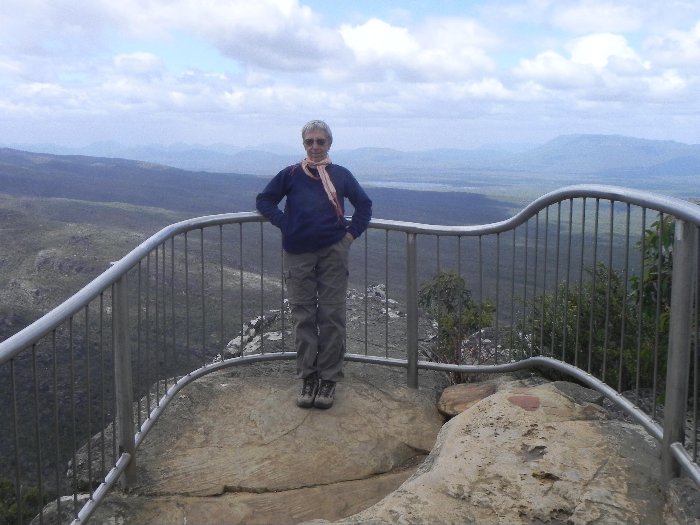 Beate steht am Lookout-Point mit Blick auf die Bergwelt der Grampians