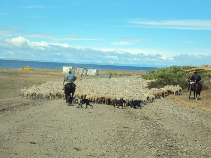 Schafherde kreuzt auf der Y85 km 34 /- Bahia Inutil