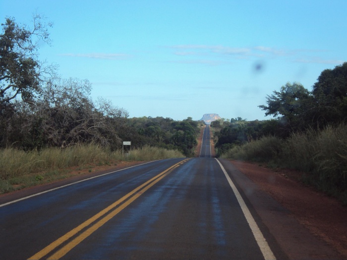 Schnurgerade Straße und im Hintergrund ein Tafelberg