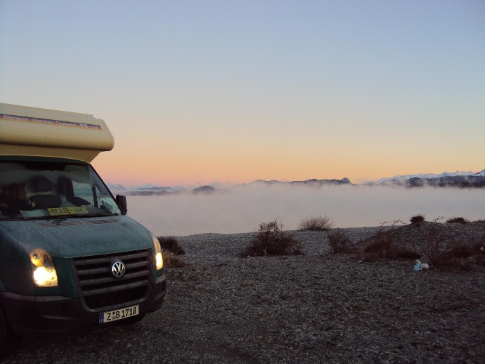Sonnenaufgang am Lago Nahuel Huapi - der See dampft, denn es ist sehr kalt