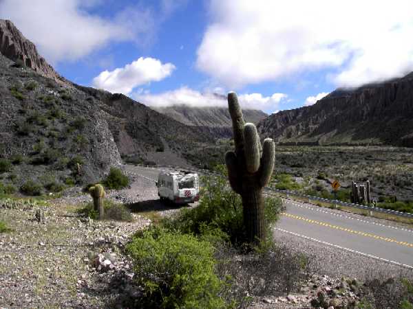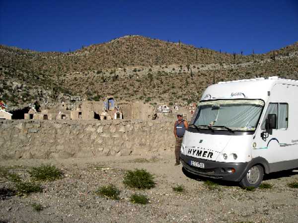 Der Aufenthalt in Salto fällt sehr kurz aus, denn erstens regnet es und die Straßen sind schon am Morgen voll gestopft von Autos und Menschen. Es ist fast aussichtslos, einen Parkplatz zu finden. Der längst überfällige Besuch im Internetcafe ergibt sich am Rande der Stadt - aber mit sehr wenig Erfolg. Unser neu erworbenes Speichermedium "Stick" läßt sich nicht anschließen. Wir fahren weiter - hinauf in die Berge.Es geht durch die Schlucht "Quebrada del Toro", entlang der Eisenbahnstrecke, wo einmal pro Woche auch der Touristenzug "Tren a las Nubes - mit dem Zug in die Wolken" fährt. Wir schlängeln uns langsam in die Höhe - ab 2000 m Höhe dominieren karge, vielfarbige Wände das Panorama, welche dicht mit verschiedenen Kakteenarten bewachsen sind. Hauptsächlich sehen wir jedoch bis zu 10 m hohe Kandelaberkakteen, ein- oder mehrstielig. Sie stehen da wie Soldaten, welche das Tal bewachen müßten. In Santa Rosa de Tastil ist die Tagesetappe erreicht - der Ort liegt bei 3100 m - es ist gut, sich dort an die Höhe erst mal ein bißchen zu gewöhnen. Unser Stellplatz liegt neben dem Friedhof (Bild -guter Tip: dort ist es meist sehr ruhig!).