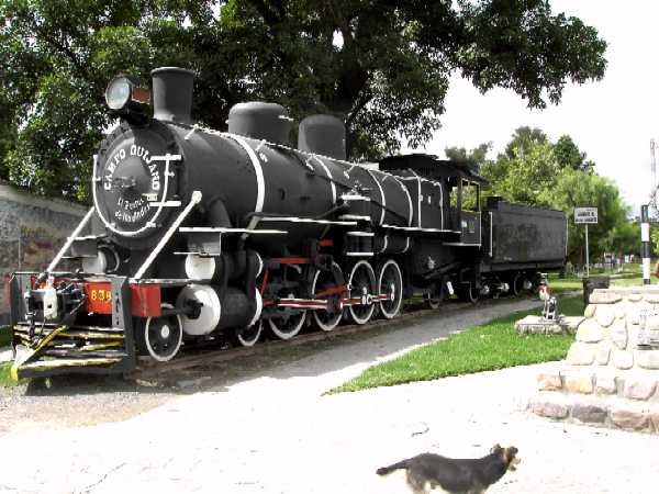 Am Morgen bemerkt Uwe, daß einer der hinteren Reifen Luft gelassen hat. Sollte nun schon der 3. Reifen den Geist aufgeben? Vorerst wird etwas Luft aufgepumpt und nun müssen wir die Sache beobachten. Die Fahrt geht weiter abwärts durch die Schlucht bis nach Salta. Dabei machen wir noch ein Foto von einer ausgestellten Lok in Campo Quiano (Bild - es soll hier auch deutsche Loks gegeben haben - wir finden aber nicht heraus, ob das eine davon war). Am Ortseingang finden wir einen schönen Supermarkt, in dem wir unsere Vorräte ergänzen und wo Uwe auch einen Internetzugang findet. Leider klappt wieder nicht alles wie es sein sollte. Uwe ist zu tiefst enttäuscht. Das Alles zieht sich ganz schön in die Länge, so daß nur noch die Zeit bleibt, ein Plätzchen für die Nacht zu finden. 2x um die Stadt und einmal hindurch und wir haben ihn gefunden. Noch einen Blick auf den defekten Reifen und es ist klar, das da etwas geschehen muß. Morgen muß das Rad gewechselt werden.