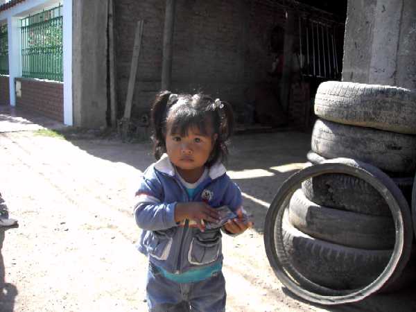 Der Reifen wird gewechselt und die Ursache gesucht - und siehe da, ein kleines Nägelchen. Aber das ist noch nicht alles - auch die Lauffläche löst sich wieder. Kein Wunder, den Reifen wird auf diesen Pisten auch Einiges abverlangt. Dieser Reifen kann, wenn das Loch geflickt ist, nur noch als Nachhausebringer genutzt werden. Wir suchen also als erstes nach einer zuverlässigen "Gomeria" (Reifendienst). Wir steuern auf eine zu, übergeben dem guten Mann unser Rad und in ca. 45 Minuten ist alles erledigt - alles in Handarbeit - und das für 3 Peso (3,6 Peso = 1 Euro). Uwe gibt ihm 5 Peso und der Mann ist ihm sehr dankbar. Wir fotografieren noch sein Töchterchen (Bild) und suchen anschließend das Geschäft für neue Reifen, welches er uns empfiehlt und erhalten dort für 220 Euro 2 neue passende Reifen. Wir sind wieder komplett und können sorgenfrei fahren. In Deutschland hätten wir wesentlich mehr abgedockt. Wir gehen dann noch in einem kleinen Straßenrestaurant zum Mittagessen - es gibt Empanadas - das traditionelle argentische Gericht, das hier besonders gut sein soll, - Teigtaschen mit verschiedenen Füllungen. Anschließend muß Uwe noch mal ran, Reifenwechsel und Reifen auf dem Dach verstauen - nach einem Käffchen geht es dann in Richtung Thermalbad bei Jujuy. Wir nehmen nicht die Autobahn, sondern die alte Ruta 9. Es ist wenig Verkehr. Die Straße führt uns durch das Gebirge mit sehr dichtem Bewuchs, fast wie im Urwald. Es ist eine schöne Fahrt. Dort angekommen müssen wir leider enttäuscht feststellen, daß es den im Reiseführer versprochenen Campingplatz nicht mehr gibt - außerdem macht die übrige Thermalanlage keinen guten Eindruck auf uns, so daß wir dort nur die Nacht am Flußufer verbringen.