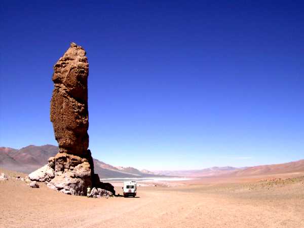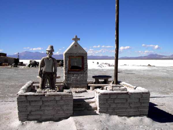 Wir fahren weiter zurück auf der Ruta 9 bis zum Abzweig Purmamarca (Ruta 52) in Richtung Paso des Jama, dem höchsten Andenpaß nach Chile. Wer Abenteuer, Einsamkeit und tolle Natur liebt, wählt diesen Paß. Von Purmamarca schraubt sich die Straße, teilweise tief in den Stein gesprengt, in 30 km Serpentinenfahrt von 2200m auf 4170m steil bergauf und dann vom Pass wieder 'runter auf 3700m bei Susques. Das blendende Weiß des riesigen Salzsees "Salinas Grandes", welchen wir auf einem Damm überqueren ist beeindruckend. Interessant ist für uns mitten im See ein Platz, wo Gebäude und etwas Kunst komplett aus Salz hergestellt waren (Bild). Susques an sich ist ein sehr armes Dorf auf dem Altiplano. Zur Gewöhnung an diese Höhen tut uns ein längerer Aufenthalt hier gut. Bisher verspüren wir beide noch keine Anzeichen von Höhenkrankheit.