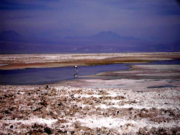 Wir wollen heute in die Salzwüste südlich von San Pedro - genauer gesagt - dort an die Laguna Chaxa - mit ihren Flamingos und anderen Wasservögeln. Der Weg führt an Toconao vorbei über eine Piste direkt durch die Salzwüste. Auf dem Parkplatz vor der Laguna verbringen wir den halben Tag, um spät nachmittags den vorgesehenen Spaziergang auf den angelegten Pfaden zu der Laguna zu unternehmen. Die Sonne brennt dort ziemlich heftig, so daß man die Mittagshitze meiden muß. Danach fahren wir nach Toconao, dort soll es ein schönes kleines grünes Tal in einer Schlucht geben mit natürlichen kleinen Wasserbassins zum Baden. Da der Tag schon fast zu Ende ist und der Eintritt, welcher hier wie überall natürlich auch verlangt wird, sich nicht mehr lohnt, beschließen wir hier zu nächtigen und morgen in das Tal zu fahren.