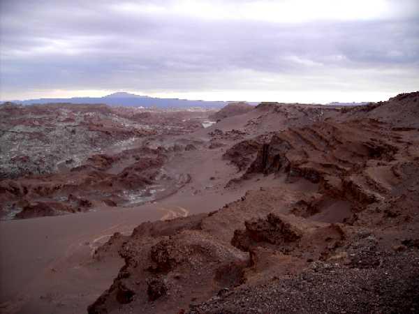 San Pedro zurück. Dort schlendern wir ein bißchen durch den kleinen Wüstenort - stellen immer wieder fest, wie bescheiden doch die Lebensverhältnisse hier sind - besuchen einen kleinen Kunsthandwerkermarkt und fahren anschließend in das "Valle de la Luna". Den Besuch zögern wir noch ein bißchen hinaus, da er bei Sonnenuntergang am besten sein soll. Wind und Wetter schufen dort in Jahrmillionen eine bizarre Formenwelt, schliffen Türme und Figuren aus Sand, Salz und Lehm und schichteten große Dünen auf, so steht es im Reiseführer. Weil wir zu lange auf dem Parkplatz stehen ohne ein Billet zu kaufen, gibt es Ärger, an eine Übernachtung dort ist also gar nicht zu denken. Da sich der Sonnenuntergang zum Überfluß auch noch hinter dicken Wolken versteckt, verzichten wir lieber auf den Besuch und wollen uns vor dem Dunkelwerden einen anderen Stellplatz suchen. Bei der Weiterfahrt von San Pedro in Richtung Calama durch diese bizarre Landschaft können wir von oben in das zerklüftete Tal sehen und werden so noch etwas für den Verzicht entschädigt. Die Umgebung von San Pedro ist ein eizigartiges Naturwunder. Nun geht die Reise weiter - wir hoffen auf eine Übernachtungsgelegenheit noch vor Calama. Leider ist die Strecke wir ausgestorben - reichlich 100 km kein Haus, keine Tankstelle und Nichts. Die Lichter von Calama tauchen auf - die Hoffnung keimt - doch dieser Stadt kehren wir gleich wieder den Rücken - hier kommt man sich vor in einer Goldgräberstadt vor 100 Jahren - einfach chaotisch. Wir könnten hier nachts kein Auge schließen. Also geht es im Dunkeln weiter in Richtung Antofagasta - es wird wohl bald eine Tankstelle kommen - so hoffen wir .... - leider vergebens. Im ersten Ort nach über 100 km bleiben wir auf dem ersten besten uns bietenden Platz stehen und fallen nach einem kleinen Abendmahl in tiefen Schlaf. Der Tag machte dem 1. April alle Ehre.
