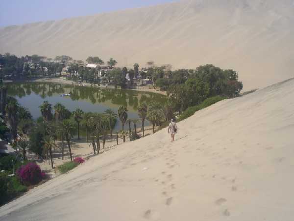 Wir besichtigen nach unserem Frühstück die Inka-Wasserkanäle, fahren weiter in die Stadt Nazca, um ein Internetcafe aufzusuchen. Unsere Schiffspassage von Süd- nach Mittelamerika muß sichergestellt werden - kein leichtes Unterfangen. Nachdem eine entsprechende E-Mail abgesetzt ist, wollen wir uns zu den Geoglyphen von Nazca begeben und uns evtl. noch das Museum von Maria Reiche, eine Dresdnerin, welche ihr Lebenwerk in der Erforschung dieser seltsamen riesenhaften Bodenzeichnungen in der Wüste sah, ansehen. Bei km 420 auf der Panamericana steht ein Turm, von welchem aus man schon Einiges sehen kann. Man könnte auch ein Flugzeug chartern und sich die Linien aus der Luft ansehen - das ist uns jedoch der Preis nicht wert. Wir sind auch so schon beeindruckt. Die Fahrt entlang der Panamericana in Peru geht weiter - Wüste, Wüste pur. Von Ica aus geht es in eine kleine Oase mit Palmen, einer Lagune und bestimmt mehr als 100 m hohe Sanddünen. Es ist Sonntagnachmittag - es herrscht hier ganz schöner Touristenrummel - viele große Buggies, welche durch die Dünen donnern. Wir igeln uns erst mal ein und wollen uns die Sache am nächsten Tag einziehen. |