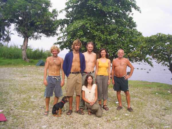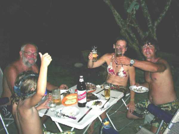 Unsere Entsorgungstanks sind randvoll - müssen dringend geleert werden. Außerdem benötigen wir eine Wasserbetankung. Das bedeutet, wir müssen ausschwärmen. Bis zur nächsten Tankstelle, von der wir auch Wasser erhoffen, sind es etwa 40 km - die Fahrt auf der von Schlaglöchern übersäten Straße ist nicht sehr angenehm - es muß jedoch sein. Wir holen Benzin für unseren Generator und Diesel fürs Mobil und bekommen unser Wasser. Dann wollen wir noch im Urwald entsorgen, was uns bald zum Verhängnis wird, denn wir bleiben erst einmal im vom Regen durchweichten Boden abseits der Hauptstraße stecken. Mit viel Mühe gelingt es Uwe jedoch, uns wieder zu befreien - aber entsorgt haben wir nun. Jetzt kann es zurückgehen. Brot und Bier wird unterwegs noch eingekauft. Zurück zum Strand, treffen wir wieder Lorenzo und Co. - wir machen gemeinsame Tee-Time vor unserem Mobil. Lorenzo als eifriger Taucher bringt einen großen Fisch aus dem Meer, mit der Harpune erlegt - wir beschließen einen gemeinsamen Grillabend zu veranstalten. Es wird ein langer und lustiger Abend Bild). |