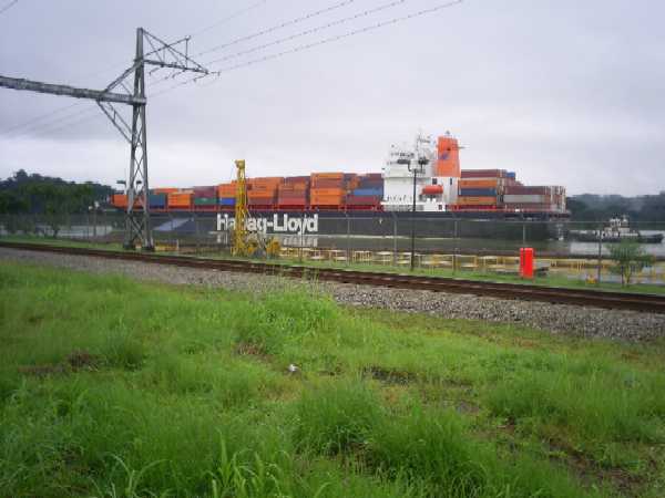 Früh werden noch Adressen ausgetauscht und nach einem Schnappschuß für unser Tagebuch und unserem Eintrag in ihr Reisebuch verabschieden wir uns von unseren Landsleuten, fahren zunächst noch ein Stück weiter in Richtung Westen, kommen so bis zur Fähre , welche zur "Isla Grande" übersetzt - dort soll es tolle Strände geben, aber leider Alles nichts für Leute mit unserem Mobil. So kehren wir um. Die Fahrt ist schwühl und naß vom Schweiß - so geht es zurück bis Gamboa. Dies ist ein kleines Städtchen direkt am Panamakanal - man kann hier schön stehen mit unserem Auto und beobachten, wie die riesigen Kontainerschiffe (Bild) durch den Kanal ziehen. Ein richtiges Tropengewitter entlädt sich inzwischen über unseren Köpfen - ist auch nicht zu verachten - aber mit der Zeit gewöhnt man sich daran. |