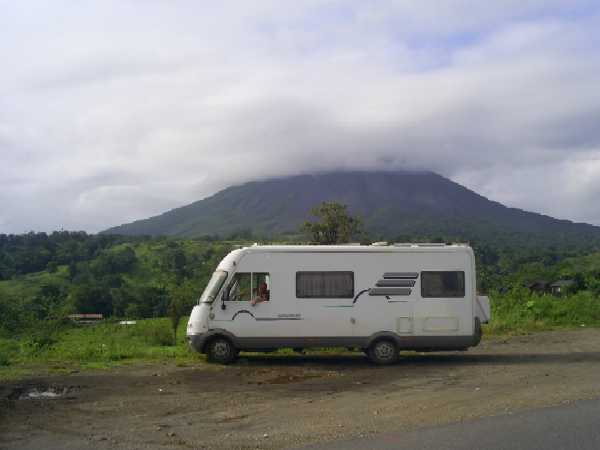 Tatsächlich spüren wir, daß die drückende Tropenhitze etwas nachläßt je weiter wir uns nach oben bewegen. Im Städtchen La Fortuna finden wir eine Touristinformation mit Internet - fein für uns, beides können wir gebrauchen. Viel erfahren wir zwar nicht, Prospektmaterial ist auch sehr rar, aber wir können wenigstens noch unsere wichtigen Mails absetzen. Dann begeben wir uns zur Umfahrung des großen Vulkanes bis hin zum Eingang in den dazugehörigen Nationalparkes. Wir stellen fest, daß man, vorausgesetzt -die Wolken (Bild) lassen ihn 'mal frei, den schwarzen Vulkankegel schön sehen kann und auch ab und zu ein Rauchfähnchen und werden ein bißchen mistrauisch, womöglich stimmt das mit dem "aktiv sein" gar nicht. Touristisch erschlossen ist zwar dieses Gebiet sehr - ein Hotel, eine Touristenunterkunft reiht sich an die nächste - und Alles vom Feinsten. Wir wollen den Abend abwarten, für die Nacht wird das Spektakel in den Prospekten versprochen. Für den Rest des Tages suchen wir uns einen schönen Platz am See und bei Einbruch der Dämmerung geht es zurück zum Fuße des Vulkanes. Wir stellen uns so auf, daß man direkt vom Bett aus den Vulkankegel sehen kann - wie im Autokino - nur wir können sogar zwischendurch mal ein Nickerchen machen. Wir wollten es nicht glauben, doch bei Nacht sieht man, wie der Berg sozusagen Feuer speit und die glühenden Lavabrocken am Hang herunterrollen - ist schon ganz imposant. Es wird eine unruhige Nacht - gegenseitig müssen wir uns immer wieder wach rütteln. |