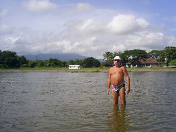 Die Grenzübergänge werden immer belastender. Kaum sind wir angelangt am Zoll- und Migrationsgebäude, werden wir umlangert von mehreren Personen, welche uns zeigen wollen, was wir zu tun hätten und wohin wir uns begeben müßten. Es ist direkt mühsam, sich auf eine Person zu beschränken. Die Formalitäten in Costa Rica sind recht schnell abgewickelt. Nur am Schluß erscheinen wieder all die lästigen Personen von vorhin, sie würden unser Auto inspizieren und würden dies uns zuliebe innerhalb einer Minute erledigen (üblicherweise würde es 1 Stunde dauern) - Holzauge sei wachsam. Dafür sollten wir bei ihnen Dollars in für Nicaragua erforderliche Cordobas tauschen. Das tun wir natürlich nicht - wahrscheinlich hatten sie nicht einmal das Recht, unser Auto zu inspizieren - man muß schon ganz schön auf der Hut sein - man läßt sich hier allerhand Tricks einfallen. Wir steigen in unser Auto und ab geht es zur anderen Grenzseite - mal sehen, was uns dort erwartet. Schnell alle Luken zu, denn zuerst geht es durch einen Tunnel, wo wir für 5 US$ erst einmal desinfiziert werden. Wieder werden wir umringt - gleich mehrere wollen uns in eine Parklücke einweisen, weitere Personen wollen Gide spielen, eine Frau will uns eine Versicherung einreden und mehrere Jungs wollen auf unser Auto aufpassen - eine richtige Landplage, man wird regelrecht überfallen. Jetzt nur an alle erforderlichen Papiere denken. Zuerst geht es zur Migration, dort zahlen wir pro Person für den Stempel im Paß 7 US$, dann geht es zur Versicherung - für 12 US$ bekommen wir dort ein schönes Formular, dann geht es zur Aduana - dort dauert es lange, ehe sich die Beamtin mit unserem internationalen Zulassungsschein auseinandergesetzt hat, für einen Stempel von der Polizei auf der temporären Einfuhrgenehmigung müssen wir dann nochmals eine Stunde warten, der Polizist ist gerade mal irgendwo unterwegs. Unser Gehilfe bekommt von uns 2 US$ und beim Passieren des letzten Grenzposten müssen wir nochmals 2 US$ zahlen, für was das ist - wir wissen es nicht. Aber nun geht es auf teils recht ordentlicher Straße in Richtung Granade am großen Lago Nicaragua. Es soll der einzige Süßwassersee sein, in welchem es Haie gibt. Wir erreichen am Nachmittag die Stadt - sie hat einen recht netten Stadtkern, alte Kolonialpracht - nach den Schildern "Al Lago" richtend geht es zum See. Direkt ans Ufer des Sees gelangt man nur durch ein großes Tor in die "Zone de Touristiko". Die von uns verlangte Eintrittsgebühr von 30 Cordoba wollen wir bezahlen, indem wir unseren einzigen Schein "500 Cordoba" - den wir am Automaten gezogen haben - hinreichen. Viel zu groß, meint der Bursche, wir sollten erst wechseln gehen. Wir drehen um und klappern nach und nach 6 Restaurants und ein Antiquitätengeschäft ab. Ja 500 Cordoba (etwa 30 US$) sei viel zu viel, das könne man nicht wechseln. Vielleicht glaubten sie auch, es sei Falschgeld. Schon etwas genervt steuern wir nun eine Bank an. Bei der ersten schickt man mich zur Kasse - ca. 20 Personen stehen dort an - ich mache kehrt. In der nächsten Bank sind es vielleicht nur 10-15 - dort reihe ich mich ein. Uwe wundert sich draußen im Auto als zwischendurch die Securita die Bank schließt und ahnt nichts Gutes, verlangt mit viel Gezeter den Zugang zur Bank, um zu sehen, daß ich wirklich noch drin bin. Das Wechseln von ca. 30 US$ ist ein Akt von ca. 2 Stunden gewesen - fast nicht zu glauben. Zurück zum großen Tor am See läßt man uns dann endlich passieren. Wir finden auch direkt am Ufer einen schönen Stellplatz. Der See ähnelt in Manchem dem Plattensee - sehr flach, man muß fast einen Tagesmarsch absolvieren, um bis zum Hals im Wasser zu stehen (Bild). Am Morgen ist er noch ganz frisch, doch während des Tages heizt er sich auf bis zu Badewannentemperatur - bestimmt 40 Grad - wirklich keine Abkühlung. Aber ansonsten sind die Temperaturen hier erträglicher, weil die Luft trockener ist. Wir verbringen hier doch einige schöne Tage. Die Menschen hier sind sehr neugierig und sehr freundllich. |