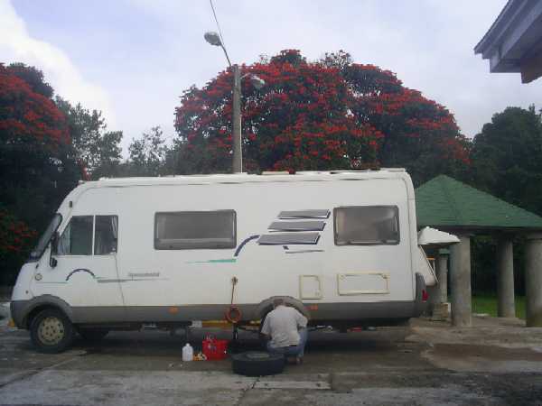 In der morgentlichen Kühle inspiziert Uwe unsere Reifen. Der nächste Kandidat ist fällig - sogar der Stahlgürtel ist mächtig beschädigt. Er muß also runter. Uwe macht sich an die schweißtreibende Arbeit, wechselt die Räder und ersetzt das defekte Rad (Bild), dieses kommt mit dem noch vorhandenen neuen Reifen vorn ins Mobil bis zur nächsten Gomeria. Wir füllen noch Wasser auf und weiter geht es. In einer der am Weg liegenden Reifenwerkstatt lassen wir uns für ca. 0,80 Euro den Reifen wechseln - die Sache dauert keine viertel Stunde und wir können die Fahrt fortsetzen. Noch ein Internetbesuch am Weg, dann geht es durch San Pedro Sula - eine Stadt, man glaubt in einer anderen Welt zu sein - pompös, modern, mit Casinos, großen Restaurant, Hotels usw. - wenige Kilometer danach wieder das triste Leben der normalen Einwohner mit ihren armseligen kleinen Anwesen. Der große Unterschied zwischen Arm und Reich ist hier besonders deutlich zu sehen. Wir kommen noch bis an die Karibikküste und bleiben, da es schon dunkelt am Ortseingang auf einer großen Tankstelle stehen. Gegen unsere Gewohnheit holen wir uns im Fast-Food-Restaurand Hamburger zum Abendbrot und wollen uns zur Ruhe begeben. Die Nacht wird nicht sehr angenehm - das Ankommen und Abfahren der vielen großen Brummis macht viel Lärm und läßt uns erst in der zweiten Nachthälfte den rechten Schlaf finden. |