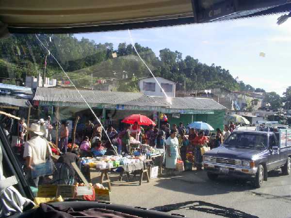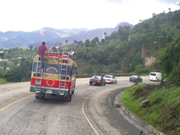 Heute geht es weiter in Richtung mexikanischer Grenze. Wir befinden uns wieder einmal auf der Panamerikana, es ist ganz schön viel Verkehr und wir können uns wieder einmal über die wirklich gewagten Manöver der einheimischen Busfahrer entsetzen. Bild: Nach gewagtem Überholmanöver - natürlich in der Kurve, bei Gegenverkehr - kommt der "rechte Blinker" = Beifahrer aus der hinteren Tür, steigt auf's Dach und sieht nach, ob noch Alles richtig fest ist! In Huehuetenango haben wir erst erfolglos Reifen gesucht und dann auch nach längerem Suchen einen ruhigen Platz im besseren Wohnviertel gefunden. |