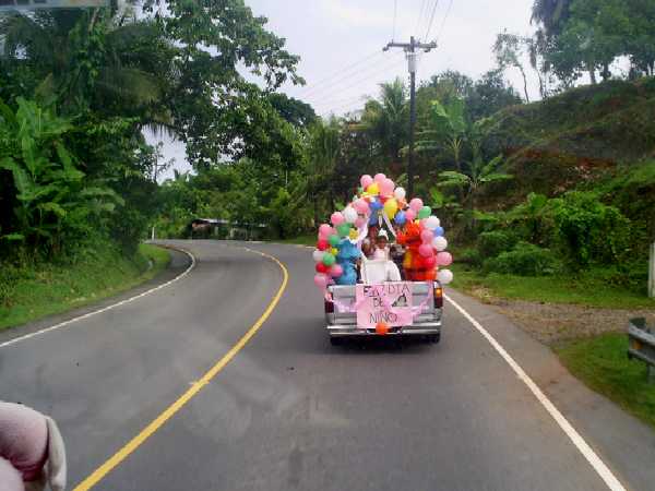 Die Fahrt nach Tikal nimmt mehrere Tage in Anspruch - wir wollen uns ja auch Zeit lassen, um viel von der Landschaft, welche wieder deutlich exotischen Charakter annimmt , und den Leuten mitzubekommen. Beim Überschreiten der Bezirksgrenze nach Peten werden wir von einer sogenannten Fruchtkontrolle überrascht. Man will sich hier vor dem Einschleppen der Fruchtfliege schützen. Die Beamtin findet meine erst am Vortag erworbenen schönen großen Weintrauben im Kühlschrank. Bananen und Apfelsinen übersieht sie zum Glück. Also entweder die Weintrauben verschwinden in unserem Magen oder im Büro der Kontrolleure. Wir entscheiden uns für das Erstere und machen erst mal Siesta am Straßenrand. Auf der Weiterfahrt haben wir (wahrscheinlich) einen Kindergeburtstag - mal anders - getroffen (Bild). Am Abend finden wir einen Stellplatz neben dem großen Freizeitpark "Santa Isabel" hinter einer Tankstelle, nur wenige Kilometer vom eigentlichen Ziel entfernt, wo sich dann am Abend auch noch einige Sattelschlepper einfinden. Das übliche abendliche Gewitter läßt nicht lange auf sich warten. |