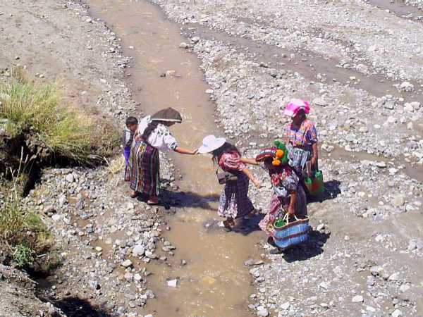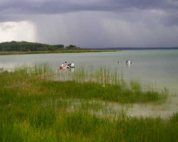 Wenige Kilometer vor Sta. Elena besuchen ich die Touristinformation. Dort erhalte Informationen über Öffnungszeiten, Camping- und Parkmöglichkeiten u.a. im Nationalpark "Tikal" und eine sehr informative Karte. Wir besuchen noch kurz die kleine Insel Flores, welche durch einen Damm mit Sta. Elena verbunden ist , - nach einem erfolglosen Versuch im dortigen Internetcafe, einen Zugang zu unserer Mailbox zu bekommen, geht es dann zurück und weiter in Richtung zur 60 km entfernten Ausgrabungsstätte. Vorher, in El Remate, stoßen wir wieder auf den See "Peten Itza" und finden gleich einen neu angelegten großen Platz direkt am Ufer des See. Wir beschließen, dort den noch verbliebenen Tag und die Nacht zu verbringen.Wir beobachten, wie sich die Frauen des Ortes direkt im See kleine Waschplätze zum Waschen ihrer Wäsche angelegt haben. Die Frauen stehen so mehrere Stunden bis zum Bauch mitten in ihrer Waschlauge und die lieben Kinderchen tummeln sich daneben und werden so auch mit sauber (Bild). Die 2 vorhandenen Waschplätze sind von früh morgens bis zum Dunkelwerden besetzt. Sogar ein plötzlich auftretender Wolkenbruch mit heftigem Tropengewitter am Abend kann sie nicht so leicht vertreiben. Erst als die Blitze zu toll werden, verlassen sie ihren Platz für kurze Zeit. Auf alle Fälle ist die Wäscherei eine mühsame Sache für die Frauen - auf dem Kopf werden die Schüsseln mit nasser Wäsche dann weggetragen - bestimmt auch nicht ganz einfach. |