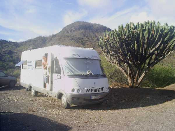 Der heutige Tag wird ein reiner Fahrtag werden, das Land ist noch groß und wir haben noch viel vor uns. Wir überschreiten 2 Grenzen (Mexiko ist ein Bundesstaat mit vielen Ländern), d.h. der Kühlschrank muß von Fleisch sowie Obst und Gemüse rein sein. Aber man will nichts sehen. Am Abend finden wir uns in einem Dorf am Marktplatz ein und richten uns für die Nacht ein. Die Mexikaner hier sind freundlich und neugierig zugleich. Trotz der Nähe der Hauptdurchgangsstraße wird die Nacht ruhig. Nur das Bellen der Hunde und am Morgen das Krähen der Hähne sind zu vernehmen. |