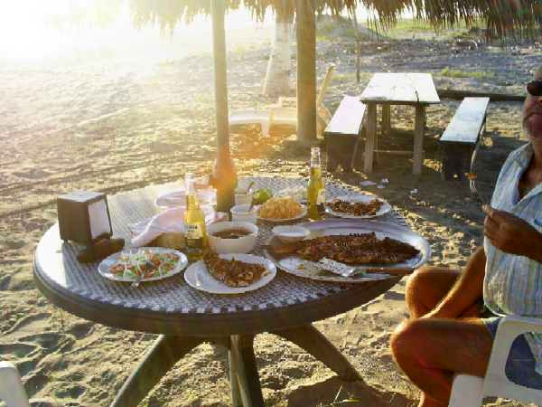 einigermaßen Baufreiheit darunter hat. Schweißtreibend ist die Angelegenheit - ich kann nur mit meinem großen Regenschirm etwas Schatten dabei spenden. Das Resultat ist etwas beruhigend - es ist wahrscheinlich nur das Lager der Lichtmaschine, mit deren Ausfall wir sowieso schon einige Tage auskommen. Aber nun muß diese wahrscheinlich ausgewechselt werden. Wir fahren zurück zum schönen Strand, um uns klar zu werden, was nun zu machen ist. 2 Möglichkeiten stehen an, entweder eine Lichtmaschine aus Deutschland schicken lassen oder versuchen, hier eine solche aufzutreiben. Beides ist nicht ganz so einfach. Bevor wir das in Angriff nehmen, legen wir noch eine Pause ein. Da unsere Vorräte auch schon zur Neige gehen, nutzen wir die gute Gelegenheit und machen dem Restaurant neben unserem Stellplatz einen Besuch. Ein leckeres Fischessen (Bild) versöhnt uns mit unseren Sorgen. Bei einem Strandspaziergang sehen wir uns einen nicht weit entfernten Trailerpark an - dort soll unser Auto repariert werden. Diesmal verbringen wir auch die Nächte hier am Strand und stellen fest, daß es hier nachts wunderschön ruhig ist - im Gegensatz zum Ort. |