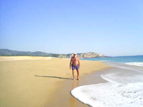 Der heutige Tag ist noch mit einigen Pflichten ausgefüllt. Es heißt, die letzte neue Batterie, die für das Fahrzeug (schon die zweite übrigens) einzubauen und die 2 alten auf anständige Weise loszuwerden. Unterwegs auf der MEX 200 finden wir geeignete Plätzchen für Alles, zum Einbau muß vor allen Dingen etwas Schatten sein, denn es ist wieder einmal ziemlich heiß. Nach getaner Arbeit kommt noch die verdiente Mittagspause und weiter geht es. Wir suchen wieder einen schönen Strandabschnitt mit Stellplätze für Wohnmobile. Bei La Mira fahren wir links ab in Richtung Küste und landen im Urlauberdörfchen Playa Azul. Lt. Reiseführer ein verträumtes Fischerdorf, wo wenig los ist - aber der Strand sehr schön und Stellplätze soll es geben. Wir finden jedoch einen Ort wie jeder andere in Mexiko - Schachbrettmuster - an der Strandpromenade ein Restaurant am anderen und viel Betrieb. Den versprochenen Stellplatz am Strand können wir vergessen (uns schwant schon lange, daß der Verfasser des Reiseführers bzgl. Stellpätze viel frei erfunden hat - hier sah es jedenfalls seit Cortez Zeiten nie so aus), wir suchen also nur noch etwas für die Nacht. Zum Sonnenuntergang begeben wir uns aber doch noch einmal mit 'nem ordentlichen Schluck Rotwein an den Strand und schauen den Mexikanern beim Baden zu. |