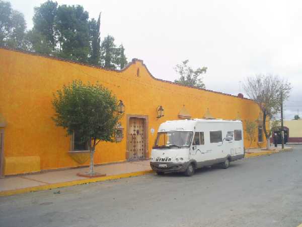 Es geht weiter auf der MEX 45 - Zacatecas ist unser Ziel. Sie soll eine der schönsten und ehemals reichsten Kolonialstädte Mexikos sein. Hier wurde früher nach Silber gegraben. Kirchen und anderen Gebäude sind aus rosafarbenen bis tief rotem Cantera-Stein. Nach mehreren Anläufen finden wir auch den im Reiseführer angegebenen Parkplatz am Hotel Bosque. Wir sind noch beim Einrangieren, treffen schon weitere Traveller ein. Ein VW-Bus mit Kennzeichen aus Kanada. Um so mehr verwundert es mich, als ich deutsche Laute zu hören glaube. Es stellt sich heraus, daß wir es mit Landsleuten zu tun haben, welche vor 40 Jahren ihre Heimat verlassen haben, um in Kanada zu leben. Es sind Linda und Jürgen, ebenfalls ein Rentnerpaar, welche nur noch auf Achse sind. Sie haben ein 12 m langes Wohnmobil - so typisch amerikanisch - welches sie zeitweise irgendwo stehen lassen und nur noch mit dem Bus weiterreisen. Einen festen Wohnsitz besitzen sie nicht. Es sind nette Leutchen, viele Tipps für unsere Weiterreise können wir von ihnen bekommen. |