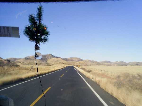 Nun durchfahren wir ein Gebiet, welches an viele Westernfilme erinnert. Die Geier schweben über uns, rechts und links Llano, ab und zu tauchen zähe, struppige, meist einstielige Palmen auf, man könnte sie mit farbigen, großen Klosettbürsten verwechseln. Ein dunkler Stiel in die Erde gesteckt und oben eine grüne Bürste. Die Glorreiche Sieben könnte gleich auftauchen. Ab und zu durchfahren wir ein kleines Dorf, welches kaum anders aussieht wie wir es aus den Filmen kennen und hin und wieder ein großes Tor als Zugang zu einer Ranch. Im Städtchen Valle de Zaragoza finden wir Asyl neben einem schön weihnachtlichen geschmückten kleinen weißen Häuschen. Weihnachtsschmuck am Haus mit hunderten von Lämpchen in mehreren Farben und blinkend wie auf dem Jahrmarkt, das ist hier in. Mit unserem kleinen Bäumchen an der Windschutzscheibe mit 5 kleinen bunten Kerzchen kommen wir da nicht mit. Aber die Einwohner sind trotzdem freundlich und nett und heißen uns willkommen. |