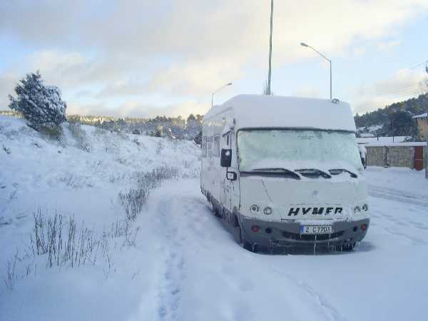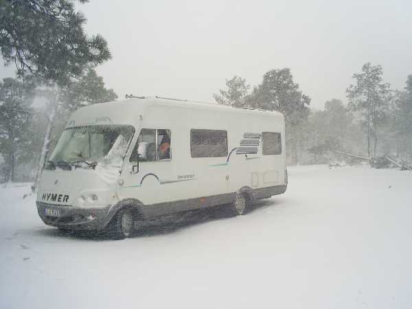 Es gibt immer noch unerhoffte Steigerungenen. Die Sonne begrüßt uns am Morgen - wie wunderschön , dafür sind die Straßen vereist und am Womo hängen dicke Eiszapfen und eine dicke Schneedecke ist obendrauf. Aber vorerst ist es pudelwarm im Mobil und wir warten ab. Wird die Sonne etwas erwirken, so daß wir hier wegkommen? Uwe wechselt vorsichtshalber die vordere Dattel gegen einen ordentlich mit genügend Profil vorhandenem Reifen aus. Ist zwar bei der Witterung nicht angenehm. Gegen Mittag versuchen wir die Flucht aus der eigentlich schönen Umgebung - nicht eine richtige Wanderung konnten wir machen - schade !! Wir staunen - die Hauptstraße ist einigermaßen geräumt. Wir lassen den Tank noch rappelvoll machen, um nach vorn genügend Gewicht zu bringen - dann weiter. An der ersten großen Steigung, noch dazu im Schatten liegend und daher auch noch voll Schnee und Eis, bleiben wir hängen. 3 mal nehmen wir Anlauf - aber vergebens. Also Uwe, rauf auf´s Mobil und runter mit vielen Schnee. Dem Fleißigen winkt der Lohn - wir rollen weiter durch eine bezaubernde Winterlandschaft bis zum Dörfchen R. Blanco. Hier fühlen wir uns sicher vor einer nochmaligen Schneeatacke. |