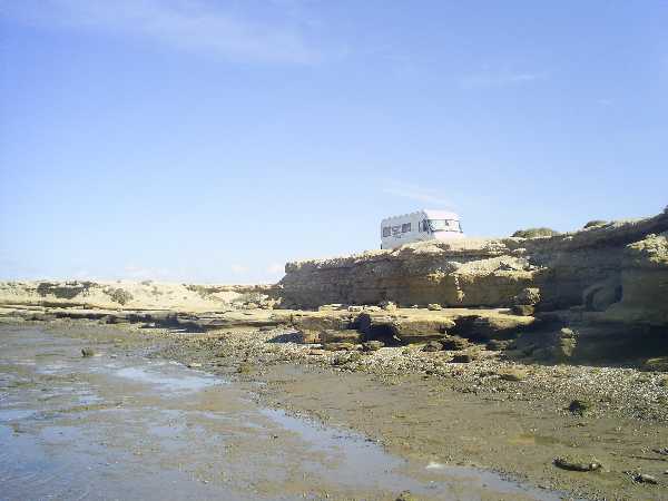 Was wir in Argentinien verpaßt haben - nämlich Wale beobachten - soll endlich nachgeholt werden, aber wenn möglich vom Standplatz unseres Mobiles aus. Wir nehmen dafür 60 km Rüttelpiste in Kauf. Langsam, fast im Schritttempo geht es zur Lagune. Die Piste will keine Ende nehmen - noch ist nichts zu erkennen vom Wasser - immer durch wüstenartiges Gelände. Von der Piste abfahren ist nicht ganz ohne. Trotzdem müssen wir uns einen Platz suchen, denn es ist schon dunkel, man erkennt kaum noch, wohin die Piste führt - es wird problematisch. Wir halten an, Uwe untersucht den Untergrund neben dem Weg und unser Nachtlager mitten im Nichts ist gebont. Auf jeden Fall werden wir hier ein himmlisch ruhige Nacht haben. |