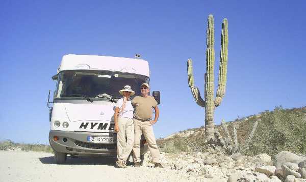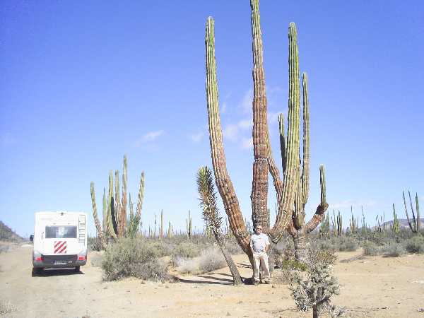 Entlang der Pazifikküste reiht sich Ortschaft an Ortschaft. In einem Internetcafe am Weg setzen wir noch einige wichtige Post ab und dann führt uns die MEX 1 ins Innere der Halbinsel. Wir erreichten den Parque Natural del Desierto (Wüste) - ein exotisches Paradies. Neben vielen kleineren Kakteen und anderen stachligen Gewächsen gibt es hier große Kandelaberkakteen und die nur hier vorkommenden Cirios-Bäume, welche 10 bis 15 m hoch werden. Da wir diese Natur etwas länger genießen wollen, suchen wir das im Reisehandbuch gepriesene Camp "Santa Ines" auf und nisten uns für 2 Tage ein. |