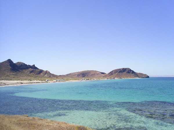 Uwe entscheidet sich nach den gestrigen Mißerfolgen für eine Reparatur des altes Spiegels. Dazu müssen wir einen Schlosser finden, was sich schon hier im Dorf erledigen läßt. Für 100 Pesos zaubert er uns eine neue Befestigung für unseren Spiegel, der zwar noch tausend Sprünge aufweist, aber vorerst geht es. Welch ein Glück, im Shop für Autozubehör finden wir dazu den passenden Spiegel zum Aufkleben. Dieses Problem hat sich nun doch noch lösen lassen. Alles anderes muß nun warten -die Wolken der letzten Tage haben sich verzogen, so daß wir uns nach einem schönen Strand sehnen. Nördlich von La Paz am Ende der kleinen Halbinsel finden wir, was wir suchten. Heute genießen wir unseren wunderschönen Platz - ein Bilderbuchstrand. Eine von schroffenBergen eingerahmte Bucht, heller Strand, türküs- bis dunkelgrün das Wasser, bei Sonnenschein ideal zum Baden (Bild). Und das Alles gibt es gratis. Wir sind die einzigen Germans hier - sonst nur Amis und Kanadier.Wir freuen uns, wieder einmal auf Schusters Rappen länger unterwegs sein zu können. Nachmittags liegen wir dann faul am Strand. |