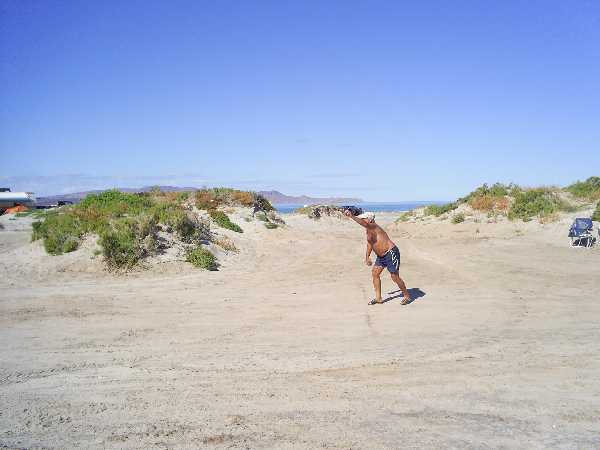 Eine Bremsenreparatur zwingt uns trotz Bombenwetters zu einem Ausflug in die Stadt. Die einzige uns vertrauenswürdig aussehende Werkstatt gibt uns jedoch eine Absage - "keine Ersatzteile - keine Reparatur". Was tun - guter Rat ist teuer - wie man so schön sagt. Auf einem großen Parkplatz kontrolliert Uwe noch einmal die Belagstärke der Bremspads so gut es ohne Abbau der Trommeln möglich ist und entscheidet sich, bis auf die USA die Angelegenheit zu verschieben. Notfalls müssen wir uns die Pads von Deutschland schicken lassen und Uwe baut sie dann selbst ein. USA-Werkstätten, so haben wir gehört, sind noch weniger kooperativ. Ich glaube aber, Uwe wird das schon selbst hinbekommen. Also kehren wir nach einem Internetbesuch und Einkauf im Supermarkt zu unserem Traumstrand zurück. Da unser alter Stellplatz inzwischen belegt ist, suchen und finden wir am anderen Ende des Strandes einen gleichrangigen.Das Wetter zeigt sich weiter von der besten Seite, strahlend blauer Himmel - kein kalter Wind. Wir sehen also keinen Grund, dieses schöne Fleckchen Erde so schnell zu verlassen. Sogar unser Boulspiel kommt wieder zum Einsatz (Bild) und abends zaubert Uwe leckere Mahlzeiten auf unserem Gasgrill. So richtige Urlaubsstimmung kommt auf.Ab und zu bekommen wir Besuch von einem netten Schweizer, es ist der einzige Deutschsprachige, den wir bisher hier getroffen hatten. Eigentlich glaubten wir, hier auch viele andere deutsche Traveller zu treffen, dem ist aber nicht so. |