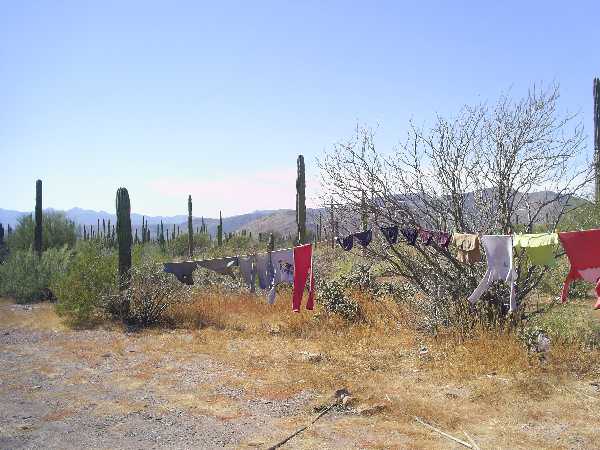 näheren Umgebung sich aufhaltenden Traveller. Wir saugen uns voll - Tank und alle zur Verfügung stehenden Kanister werden gefüllt. Jetzt fehlt nur noch ein einsames Plätzchen zum Wäsche waschen. Ab von der Hauptstraße und hinein in die Wüste. Der Wind pfeift, die Sonne scheint - ideal für einen Waschtag (Bild). Einen riesengroßen Berg schmutziger Wäsche schiebe ich schon lange vor mir her. Große Kakteen müssen hier als Wäschepfosten dienen, richtige Bäume gibt es weit und breit nicht. Uwe bearbeitet inzwischen 1,5 kg Rindfleisch, hat also auch seine Beschäftigung. Der Goulasch schmeckt lecker wie zuhaus. Nach getaner Arbeit noch ein Stück Weg bis Santa Rosalia, hinter dem Gebäude des Hafenkaptitäns finden wir einen idealen Stellplatz - ruhig und mit Blick auf´s Meer. Pelikane beobachten wir noch beim Jagen. |