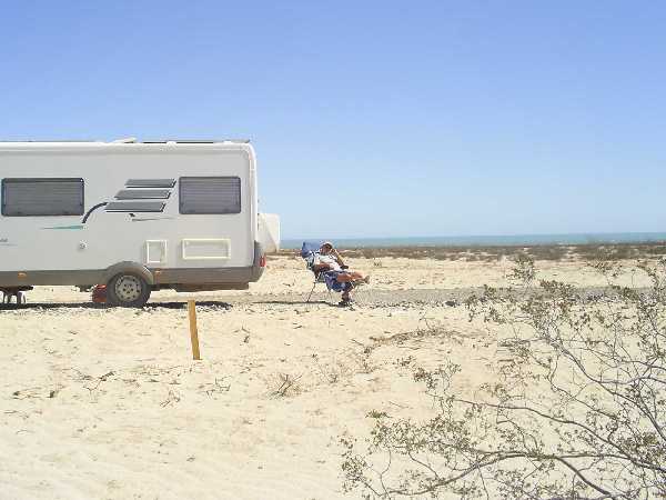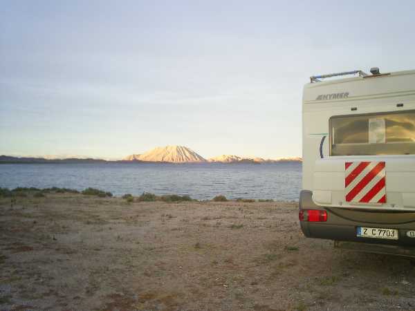 19.01.2007 - Alle Versuche in La Paz, eine Werkstatt für unsere Bremsen bzw. einen neuen Spiegel zu finden enden nur mit Enttäuschung. Der Tag verstreicht und Nichts ist erreicht. Am Abend kehren wir ganz schön deprimiert zurück nach El Centenario und finden einen Platz am Meer für uns als unser zu Hause. Wir finden es inzwischen schön jeden Morgen einen neuen Blick aus dem Wohnmobil zu haben. |