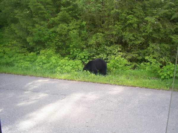 Weiter geht es auf dem Cassiar-Hwy. Wir begegnen heute sage und schreibe 7 Schwarzbären an der Straße. Am Abend trauen wir unseren Augen kaum, eine Bärenmutter mit ihrem Jungen - schnell die Kamera suchen, schon ist es zu spät. Frau Mama ist mißtrauisch und verdrückt sich mit ihrem Kleinen in die Büsche. Im nahe gelegenen Waldstück verbringen wir die Nacht. Die Hoffnung, daß sich Beide nochmals sehen lassen, erfüllt sich natürlich nicht. |