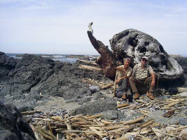 Unser Ziel ist der Nationalpark "Pacific Rim" mit dem hoch gelobten Long Beach an der Westküste von Vancover Island. Die Fahrt geht vorbei an glasklaren Seen, schneebedeckten Bergen, viel Wald und wilden Bächen - so haben wir uns Canada vorgestellt. Wir kommen dann zum Visitorcenter des NP, erwerben dort einen Nationalparkpass für alle Parks Canadas und können somit den dortigen Campground direkt über dem Steilhang - man kann sagen mitten im Urwald - von Long Beach so lange es uns beliebt belegen. Unsere direkte Nachbarn sind ebenfalls 2 Deutsche, eine Ehepaar, welche fast die gleiche Reise wie wir hinter sich haben, nur alles in der Hälfte der Zeit, mit einer geführten Tour von "Seabrigde", einem deutsches Reiseunternehmen, bis nach New Mexiko.Noch am gleichen Tag inspizieren wir den schönen in jedem Reiseführer gepriesenen wildesten Strand von Canada. Hier türmen sich wieder Mengen von Treibholz. |