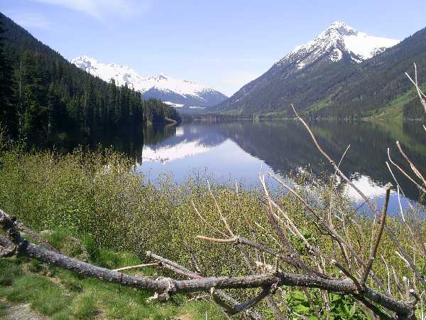 Eine Visite in Vancouver verkneifen wir uns, denn einen richtigen Scenic-Drive gibt es lt. Reiseführer nicht und außerdem ist Rush-Hour - wir würden uns womöglich nur mehr Streß als Vergnügen machen. Auf dem Highway 99 geht es gleich nordwärts. Traumhaft ist die Landschaft (Bild), leider hat Uwe zunächst noch nicht allzuviel davon, denn noch herrscht viel Verkehr auf der Straße. Eigentlich wollten wir uns heute ein Plätzchen außerhalb von Campgrounds suchen, aber noch ist die Besiedlung hier zu dicht. Ein Provincial Park Campground kurz vor Pemperton, direkt an der Hauptstraße gelegen, kommt uns am Abend doch ganz recht. |