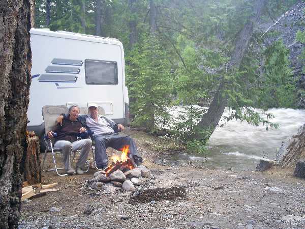 Es ist so schön hier, daß wir beschließen, noch einen Tag zu bleiben, obwohl der ohnehin schon recht gefüllte Cayoosh-Creek weiter steigt. Diesen Umstand machen wir uns zunutze, indem wir Dämme bauen und Gräben ziehen und so zur Bewässerung des Campground beitragen. Wir fühlen uns dabei fast 60 Jahre jünger und freuen uns auch wie die Kinder, wenn das Wasser so schön fließt...Am Steigen das Wassers ist das schöne, hochsommerliche Wetter schuld. Die Sonne läßt den Schnee in den Bergen schmelzen, der Bach wird langsam zum reißenden Fluß. Noch ist zum Glück keine Gefahr für uns und unser Mobil und morgen geht es weiter. So beschließen wir den Abend mit einem zünftigen Campfire, bei dem auch einiger californischer Rotwein fließt und gehen schlafen. Um zwei Uhr nachts werden wir munter: Es regnet. Das kann nun den Creek wirklich zum Überlaufen bringen. Uwe sieht nach. Tatsächlich: Trockenen Fußes kommen wir hier nicht mehr 'raus. Also weg wie nichts ehe es schlimmer wird. Wir fahren ohne große Schwierigkeiten auf die Straße und schlafen auf dem hochgelegenen Parkplatz gleich nach dem Campeingang weiter. |
