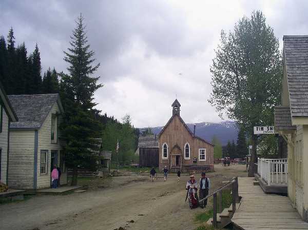Ein wolkenverhangener Himmel zeigt sich schon am Morgen. So lange wir im Auto sitzen stört das wenig. In der Ortschaft Quesnel an der S97 decken wir uns wieder einmal mit Lebensmitteln und genügend Stoff für uns Mobil ein, bis es weiter geht nach dem Goldstädtchen Barkerville. Schon auf der Zufahrt dorthin auf der S26 finden wir den Platz, den wir uns für die nächste Nacht gut vorstellen können. Der Besuch von Barkerville, die Besichtigung der einstigen vom Goldrausch entstandenen Stadt ist für uns sehr sehenswert und interessant. Wir sind begeistert. Man fühlt sich dort fast in diese Zeit zurückversetzt. Einheimische tragen die damals typische Kleidung, in den Häuschen, der Kirche in den Salons und kleinen Geschäften ist alles so wie zur Blüte des Goldschürfens (Bild). Wir verbringen dort den ganzen Nachmittag. |