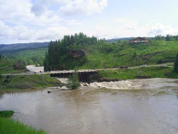 Bald haben wir eine große Seenlandschaft hinter uns von weitem sieht man schon die schneebedeckten Berge. Nach Hunston geht es wieder in die Berge. Wiesen und Wald rechts und links des Highway stehen unter Wasser, der viele Schnee des vergangenen Winters und Regenfälle lassen die Flüsse über die Ufer treten. Wir beobachten, wie in manchen Ortschaften Sandsäcke geschleppt und die Ufer vor den Grundstücken befestigt werden. Wir kommen nach Hazelton und erhalten im dorten Visiter-Center die Auskunft, daß unsere Weiterfahrt nach Prince Rupert ins Wasser fallen wird, Land unter - große Strecken des Highway sind überflutet und außerdem gibt es noch irgendwo einen riesigen Erdrutsch (wir haben vorher schon viele Straßenbaumaschinen im Anmarsch gesehen - nun ist alles klar). So bleibt uns nur ein Richtungswechsel, wie biegen in den Cassiar-Highway ab, welchen wir sowieso fahren wollten. Ein ausgedientes Camp aus der Zeit des Straßenbaus am Highway kommt gerade richtig, d.h. unsere Tagesetappe ist hier zu Ende. |