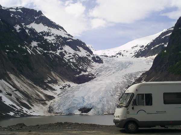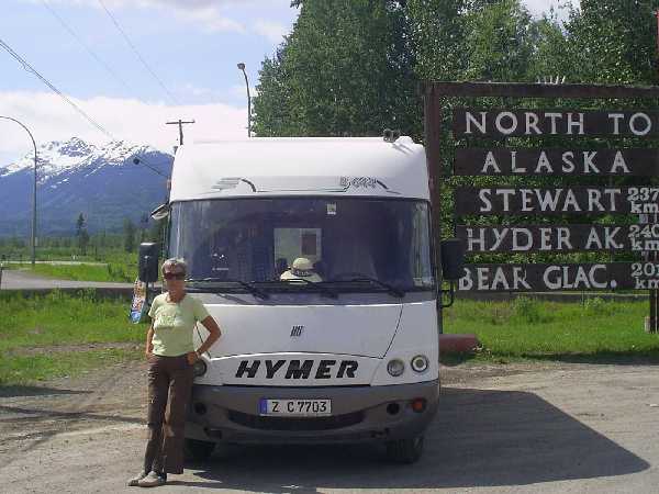 Hier auf dem Cassiar-Highway ist Kanada noch echt. Obwohl, durch den Ausbau der Straße etwas mehr, rollt hier sehr wenig Verkehr, es gibt kaum Ortschaften, nur Natur pur - eine Landschaft wie im Bilderbuch. Heute begegnen wir schon mal einem Schwarzbären, einem Koyoten und ein Biber versucht auf der anderen Straßenseite im Wasser unterzutauchen. Wasser gibt es ja im Moment überall. Dann biegen wir ab auf den Stewarthighway. Es geht vorbei an Gletschern (Bild), schneebedeckten Gipfeln und Wasserfällen, aus allen Felsspalten stürzen Wassermassen in die Tiefe. Leider erfahren wir im Visitor-Center, daß auch dort die Highliths nicht zugängig sind. Straßensperren wegen Schnee und Wasser vermasseln uns auch hier wieder unsere Vorhaben. Die Besichtigung des mächtigen Salmon-Gletschers können wir abhaken - daraus wird nichts. Wir beschließen aus diesem Grund auch den Besuch von Hyder auszulassen, da es uns wahrscheinlich außer Trouble mit dem Zoll nicht viel bringen wird. Das kleine Städtchen, was schon zu Alaska gehört, ist nur für solche ein Gewinn, die es auf den hier in Kanada verpöhnten Alkohol abgesehen haben (und wir sind ja noch versorgt, siehe oben). Es gibt dort ein paar urige Kneipen, Gift-Shops und sonst nicht viel zu sehen. Wir machen kehrt und suchen unser Nachtquartier. Dabei stellen wir fest, daß sogar der von uns schon auserwählte idyllische Platz am Clemens-Lake duch Schneebruch nicht erreichbar ist. So müssen wir mit der Zufahrt dorthin für den Rest des Tages und die Nacht vorlieb nehmen. Hier stellen wir auch fest, daß Moskitos auch zu Kanada gehören. Uwe haben sie schon ganz schön wieder im Griff. |