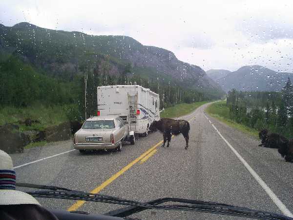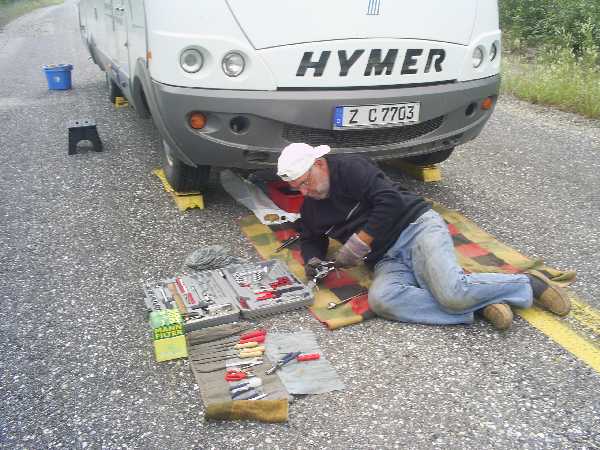 In Watson Lake besehen wir uns noch einmal genauer den "Sign Post Forest" - den Schilderwald der Besucher, welche sich hier verewigt haben.Große Ortseingangsschilder, Hinweisschilder, Autokennzeichen, ein DDR-Schild, selbstgemalte und gebastelte Bildchen und vieles mehr aus aller Welt ist hier zusammengetragen worden. So ist eben ein richtiger Wald entstanden. Ansonsten gibt es in dieser kleinen Ortschaft nicht viel zu sehen, so daß wir unsere Fahrt bald fortsetzen. Wir suchen einen Platz für Uwe´s Autowartung. Kurz hinter Contact Creek - so genannt, weil sich 1942 die Bauleute des Alaska-Highway´s von Süden mit denen vom Norden trafen - finden wir ein Stück alte Trassenführung, welche sogar eine noch recht ordentliche Teerdecke hat. Einen besseren Platz kann es nicht geben. Uwe macht den längst fälligen Ölwechsel, tauscht die Bremspad´s aus und stellt die Handbremse nach, schon ein Stückchen Arbeit (Bild). Gegen Abend ist alles geschafft. Wir sind froh, daß alles so gut geklappt hat und sitzen gemütlich beim Abendessen. Am Alaska Higway marschieren einige Büffel ohne sich vom herrschenden Autoverkehr aus der Ruhe bringen zu lassen entlang. Sie scheinen eben auch den schönen ebenen Weg vorzuziehen. Wir vermuten, es sind ein paar einzelne Herren der Gattung, welche wegen der Brunstzeit vom Büffeloberst verjagt wurden.