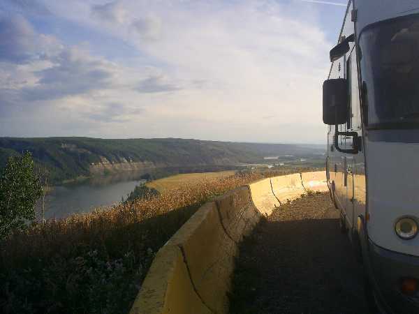 Der Himmel weint, uns ist auch fast so zumute - wir kommen langsam zurück in die Zivilisation. Aber es rollt gut auf dem Highway - wir können ohne große Mühe über 500 km zurücklegen. Kurz vor dem Punkt "0" in Dawson Creek, verlassen wir den Alaska Highway und biegen auf die S 29 ab. Uns gelegen, taucht ein Rest Area auf. Kanada hat tausend Flüsse, Seen und Bäche. Unser Stellplatz hier lag bisher fast stets an einem dieser Gewässer. Der Name ist unwichtig, aber wir stehen wieder in der ersten Reihe, hoch über einem ganz ansehnlichen Fluß (Bild). Wir hoffen, daß man uns hier in Ruhe übernachten läßt. Es gesellen sich auch noch andere Camper dazu - so wird es wohl gut gehen.