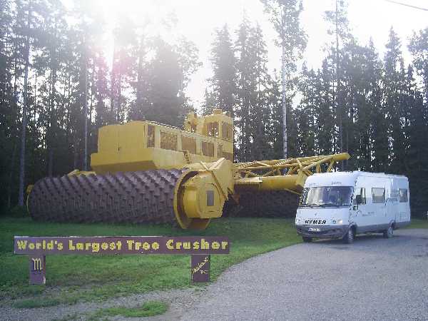 Ein kurzer Besuch in Mackenzie, die Besichtigung der größten Wald-Rodungsmaschine (Bild) der Welt muß schon mal bestaunt werden, dann geht es in Richtung Prince George weiter. Die Fahrt führt uns durch das Tal zwischen Rocky- und Caribou Mountains. Hier floriert die Landwirtschaft, ein Zubrot verdient wohl fast jeder am Tourismus - man sieht es an den schon recht komfortablen Anwesen - großzügige und schöne Wohngebäude der Ranchs. Ganz anders wie weiter im Norden - gleich ob Alaska oder Kanada. Dort mutete uns vieles ein bißchen chaotisch und arm an. In Prince George gilt es einige Besorgungen zu machen und auf dem Yellowhead Highway geht es weiter. Zur Mittagsrast ein Schwätzchen mit deutschen Touristen und gegen Abend biegen wir vom Highway einfach in einen Forstweg ein und finden einen einsamen und ruhigen Platz.
