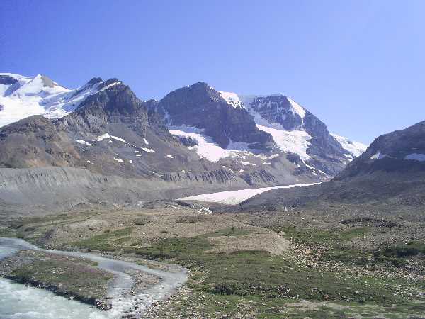 Der Icefields Parkway verläuft durch die ganze Länge - von Nord nach Süd - des Jasper- und Banff NP. Es soll die schönste Gebirgsstrecke Kanadas sein - stimmt!. Bilderbuchwetter und Bilderbuchlandschaften (Bild) begleiten uns. Die Berge der Rocky´s rechts und links, viele, viele Gletscher und Wasserfälle. Oft unterbrechen wir unsere Fahrt, um Tiere vorüber zu lassen oder näher an die Wasserfälle zu kommen. So laufen eine Bärenmutter und ihre 2 Jungen vor unserem Auto über die Straße, Bighornschafe gibt es zu besehen und anderes. Abends landen wir auf dem Überlaufcampingareal des Waterfowl CG im Park. Wir stehen dort mitten in den Bergen, umgeben von Gletschern an einem schönen Bach und genießen noch die letzten Sonnenstrahlen.