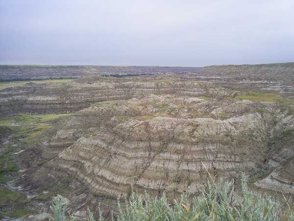 Die Großstadt Calgary lassen wir rechts liegen, große Einkäufe sind nicht zu tätigen und eine Gelegenheit zum Gas- und Dieseltanken finden wir an der Strecke. Drumheller und die Badlandsregionen von Alberta ist unser Ziel. Das Museum von Drummheller soll die weltweit größten Funde von Dinosaurierskeletten aufweisen, welche in dieser Gegend gefunden wurden. Vor 70 Millionen Jahren herrschte hier in Alberte subtropisches Klima, mächtige Wälder mit großen Tieren, den Dinos. Wind und Wasser wuschen die Canyons der Badlands nach der letzten Eiszeit aus und legten hier die Skelette frei. Doch zuvor geht es ziemlich langweilig durch große Farmlandgebiete. Am Red Deer River angelangt wird die Landschaft schon besser und wir gelangen an einen schönen Campground im o.g. Provincpark - gelegen am sogenannten Dinosaurier-Trail vor der Fähre.