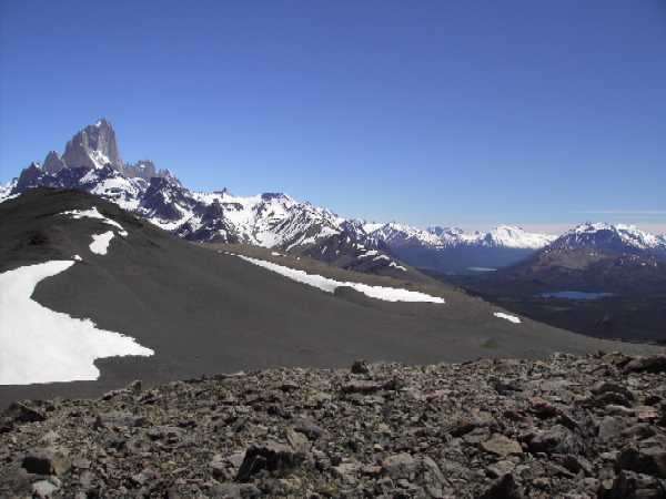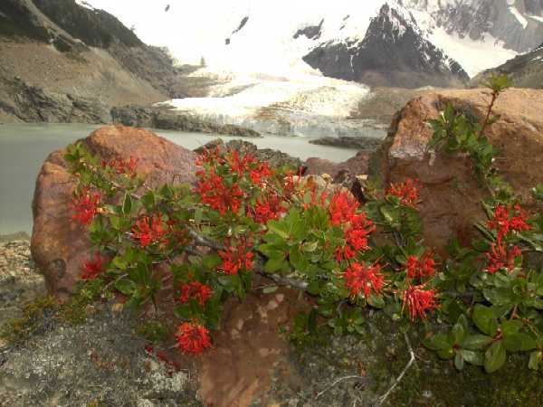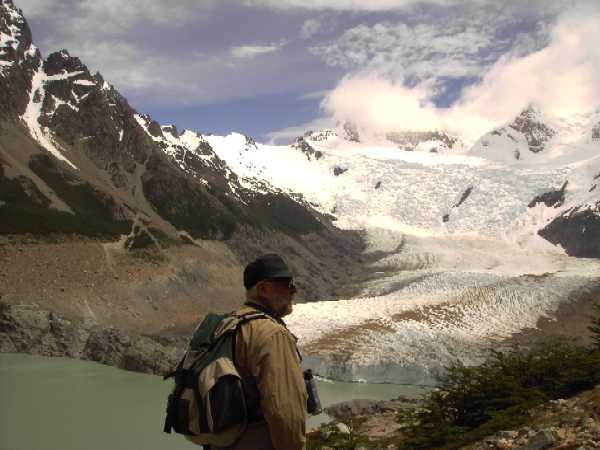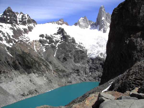 12.12.2005 - Heute soll es zum Fuße des Fitzroy gehen - eine der schönsten Wanderungen - viele Touristen sind unterwegs, wir kommen uns vor wie in der Hohen Tatra auf der großen Magistrale. So treffen wir deutsche Reisegruppen und viele Jugendliche mit Zelt und Schlafsack auf dem Rücken. Unterwegs gibt es viele Camps. Das letzte Drittel der Tour geht es steil bergauf - ganz schön strapaziös - aber wir schaffen es und werden am Ende belohnt mit einem Blick auf einen milchig-türkisblauem See unterhalb eines Gletschers am Fuße des Fitzroy-Hauptmassivs - einfach umwerfend. |